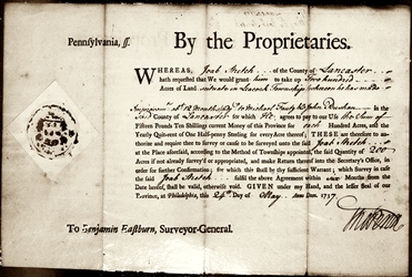 Possibly it is even online at the Pennsylvania Historical & Museum Commission website,here. On the other hand only part of the early warranties are available on line, so it may require a visit.