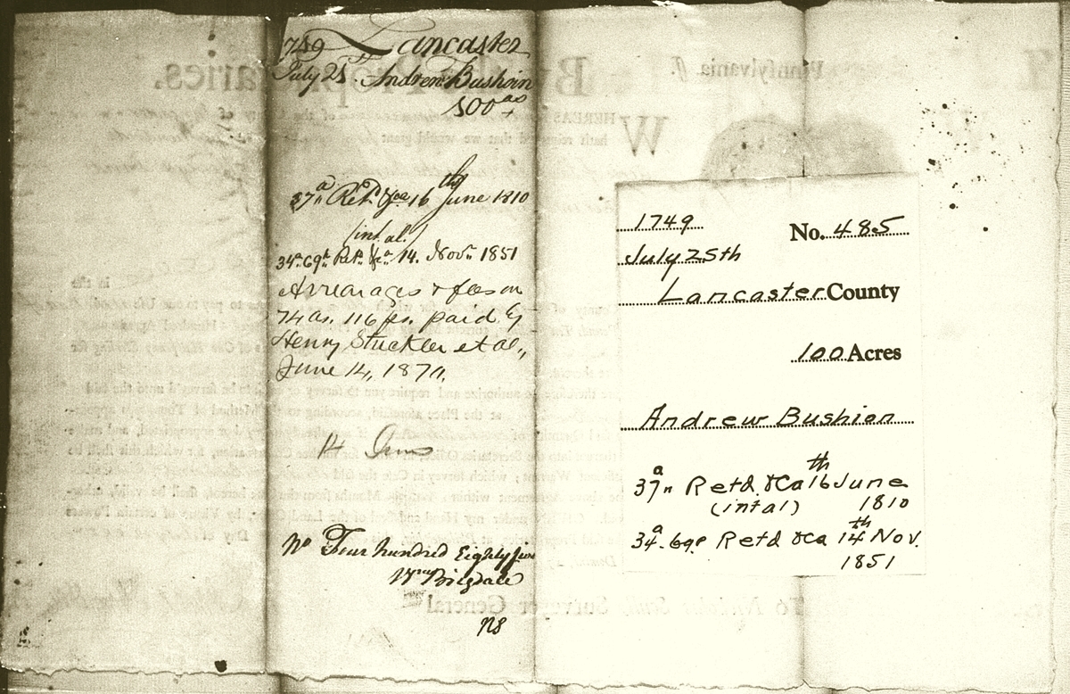 This is the only known description of Andrew's Lancaster County land, and if added to John Bushong IV's would represent the original Bushong land in America.