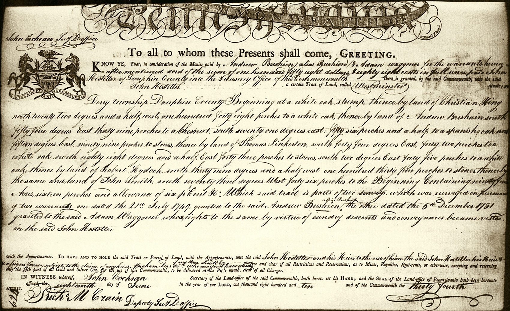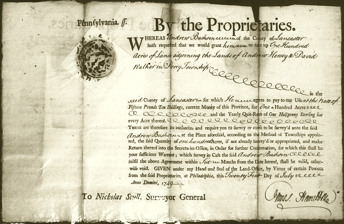 A June 18, 1810 Warrant from some of Andrew Bushong's 1749 Derry Township land.