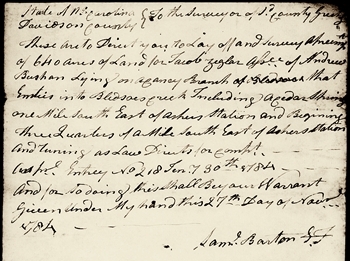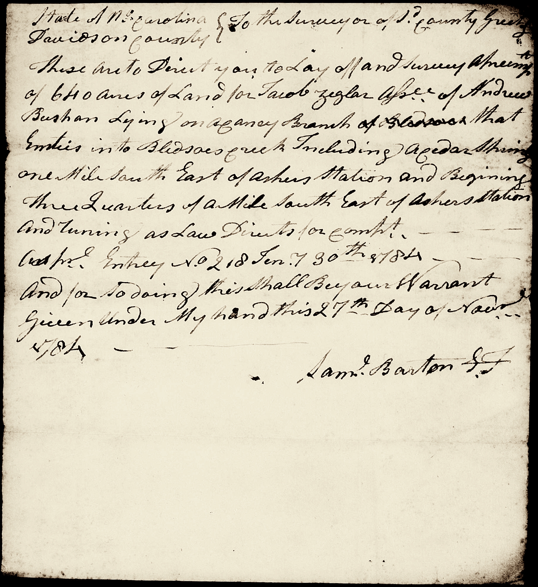 State of No Carolina Davidson County To the Surveyor of sd County Greatings. These are to direct you to lay off and Survey Apr (?) of 640 acres of Land for Jacob Zigler asse of Andrew Bushan Lying on any Branch of that Emties[sic] into Bledsoe Creek Including Adah(?) Spring one mile South East of Asher Station and begining three quarters of a mile South East of Achers Station and running as law directs for Compt Apr. Entry No 218 Ten 30th 1784 - and for so doing this shall be your warrant Given under my hand this 27th Day of Nov 1784 Saml Barton JP(?). From Land warrants, Davidson County, Tennessee: Davidson.Land Warrants 1600-1952.original