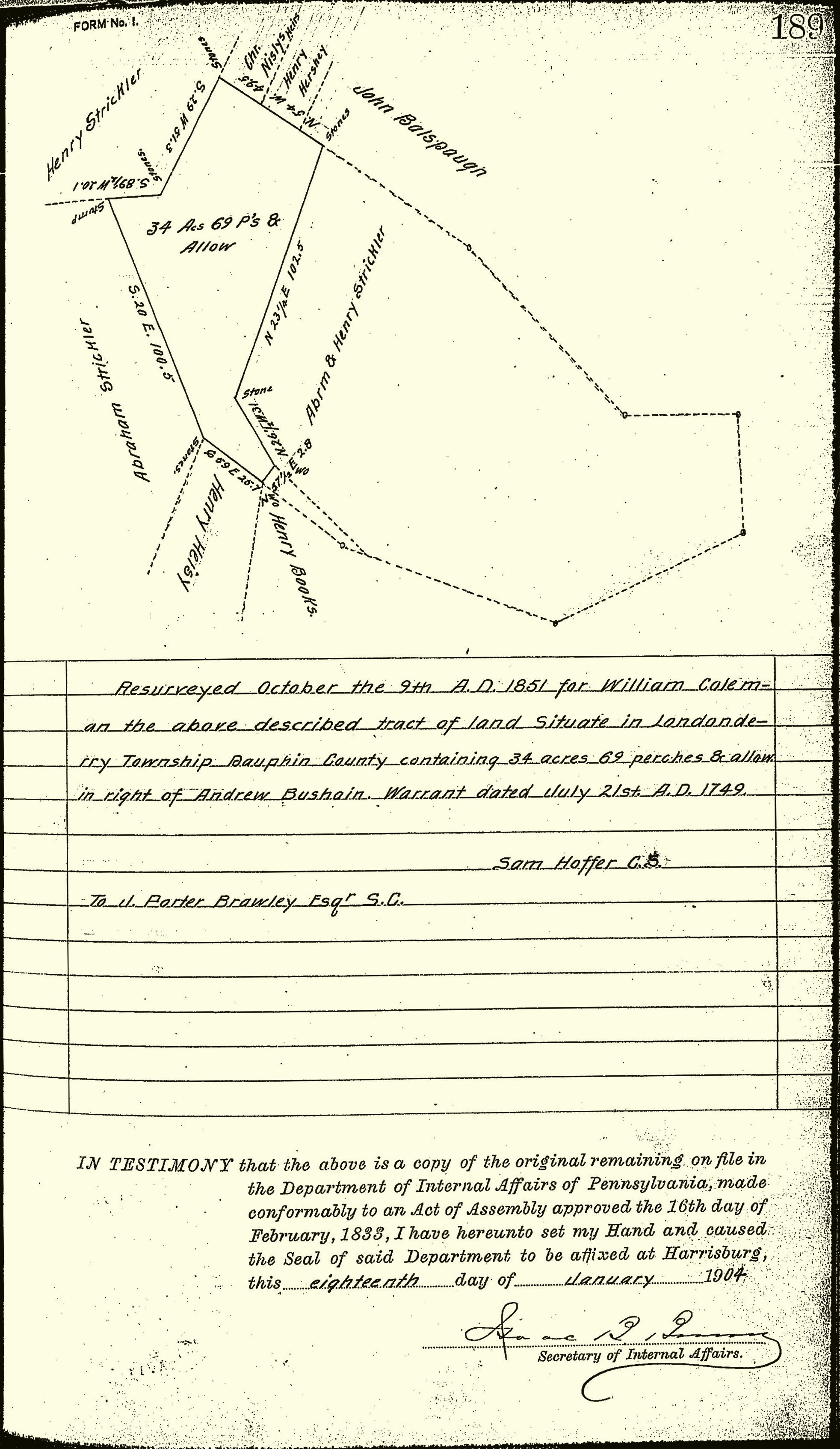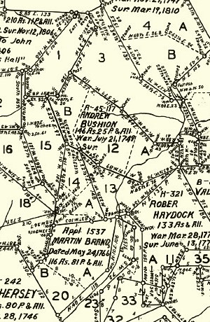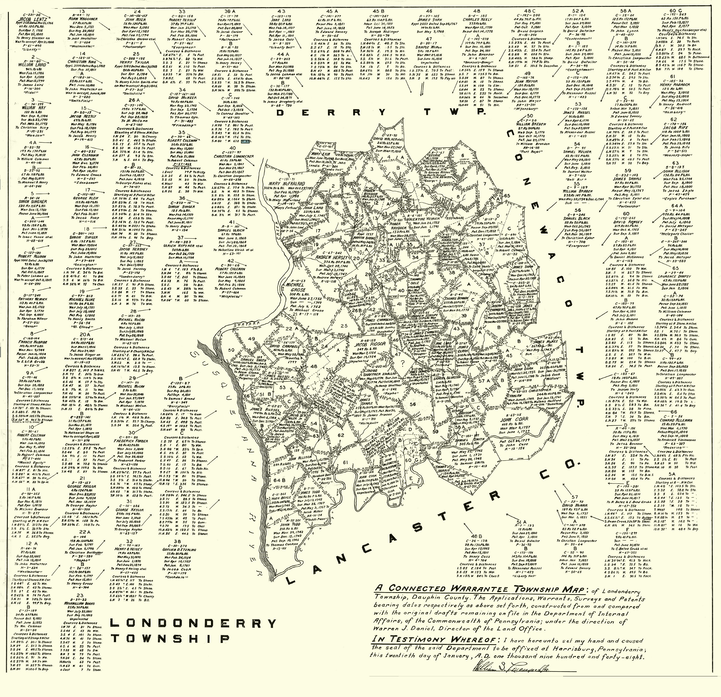 Londonderry Twp, Dauphin Co., Pennsylvania, connected land warrants map. Andrew Bushoin, is circled.