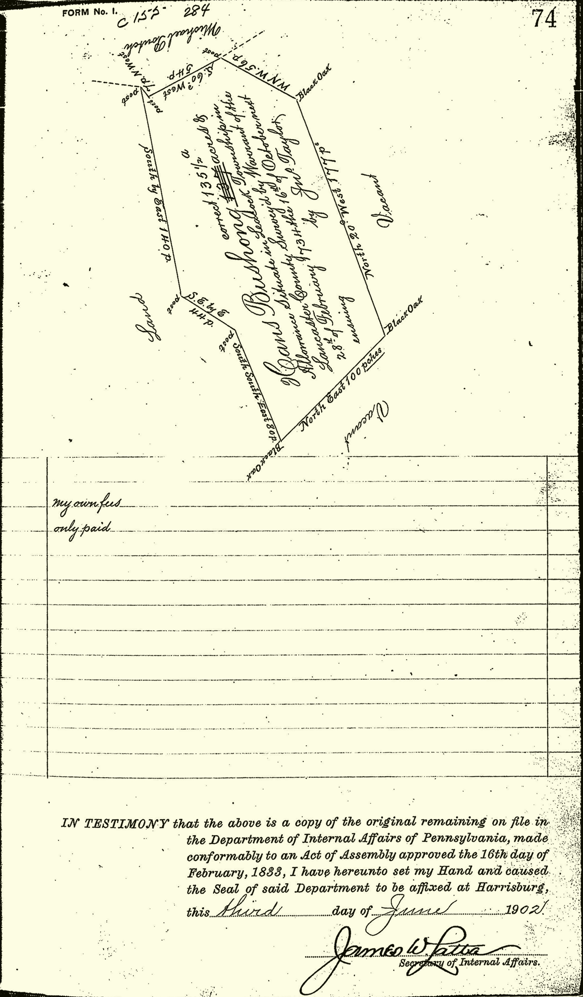 Here are select warrant survey maps, centering around Andrew Bushong and Hans Bushong, from Lancaster County, Pennsylvania, and when it was created, Dauphin County. Martin Meixel, and Adam Wagoner's warrant surveys are included, because of their association with the Colonial Bushong family.