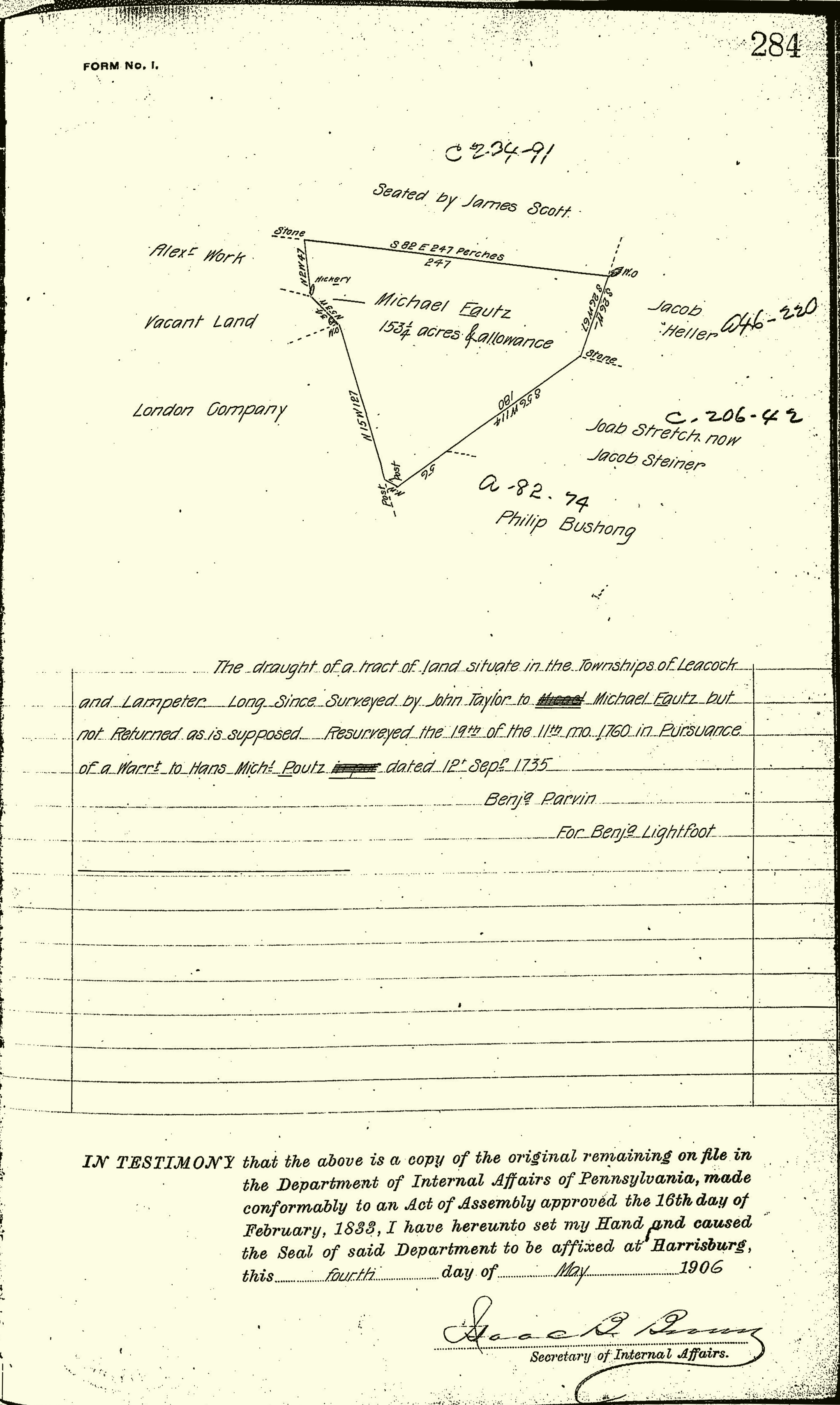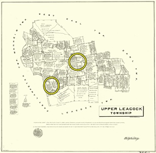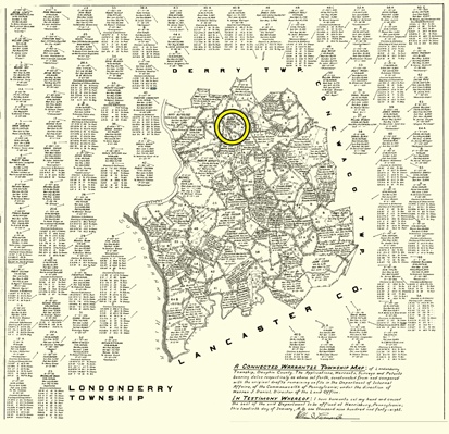 Leacock Twp., Lancaster Co., Pennsylvania, connected land warrants map. Hans Bushong circle lower left circle, Andreas Meixell[sic], in upper right circle. |