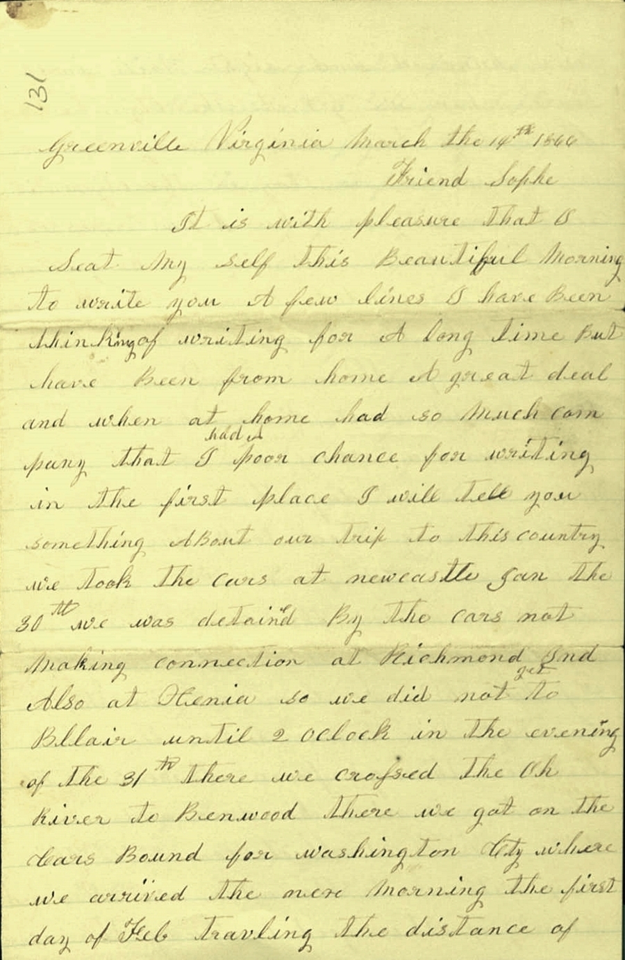 Written March 14, 1866, at Greenville, Augusta County, Virginia, by Mary Ann Bushong, (1827-1897), to a friend, Sophie Minnick (Knupp). Mary was the daughter of Abraham Bushong and Mary Christina Foland, brother, Peter (Valentine) Bushong, is mentioned in the letter.