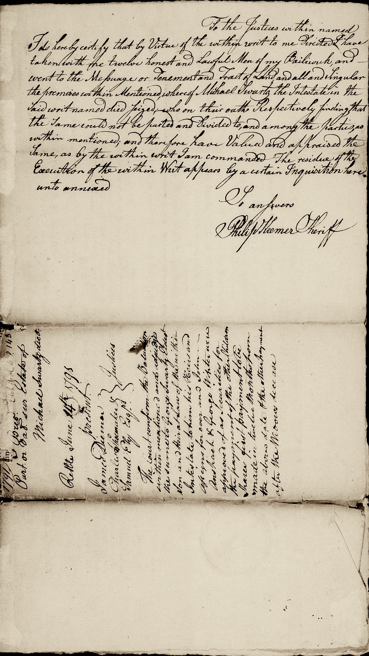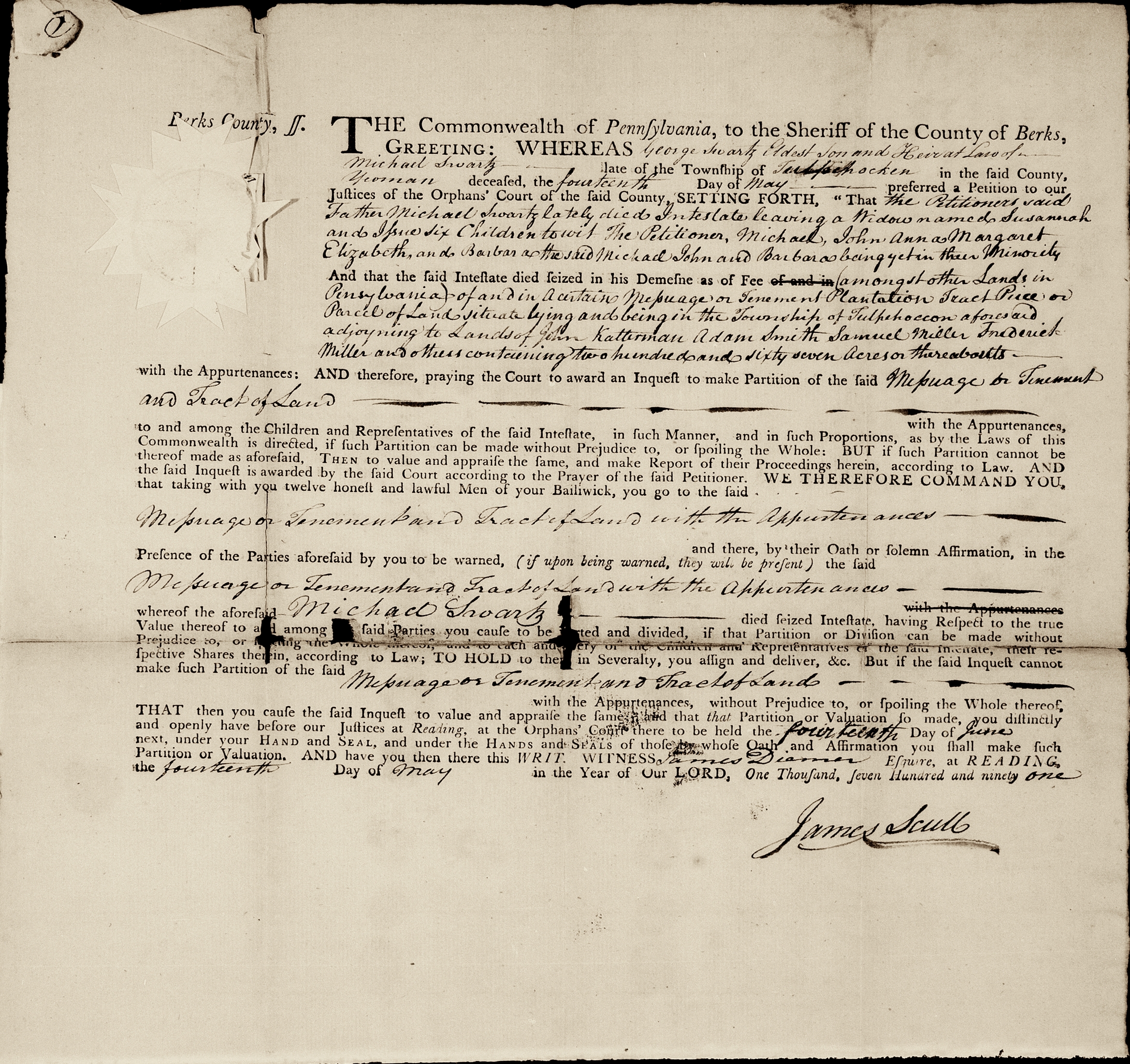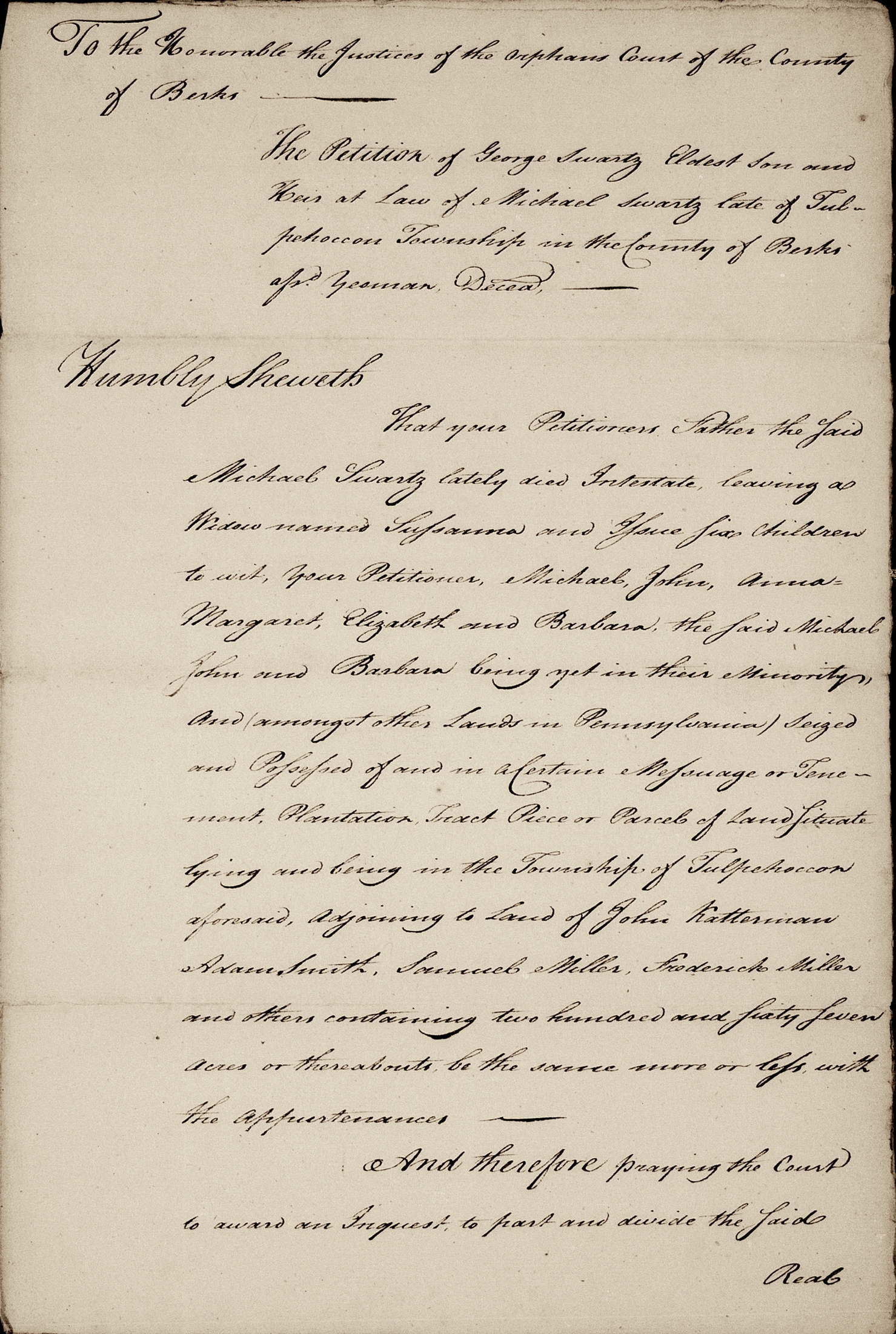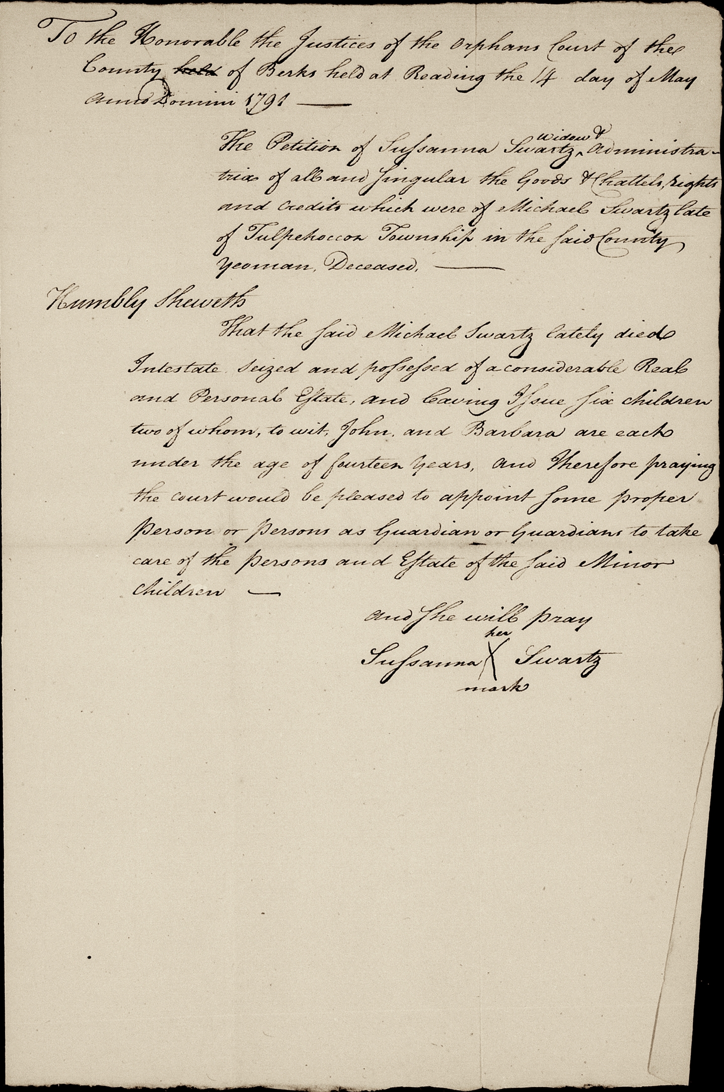 Wife Susannah... Issue Six children... George Schwartz, eldest son and heir at law of Michael Schwartz... and Michael, John, Anna Margaret, Elizabeth and Barbara. The said Michael, John, and Barbara being yet in the minority... [as of June 14 1791].