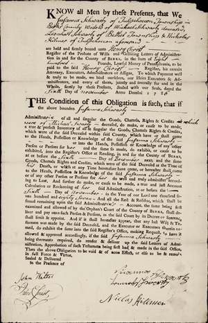 The November 6, 1786, Bond for the Michael Schwartz Estate. For Susannah Schwartz (his second wife)