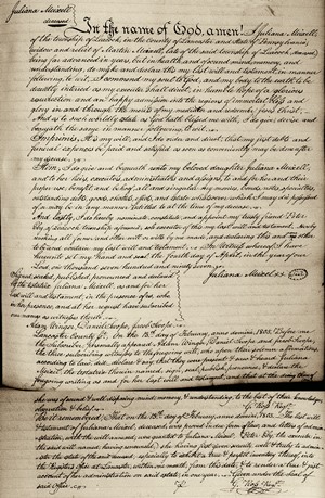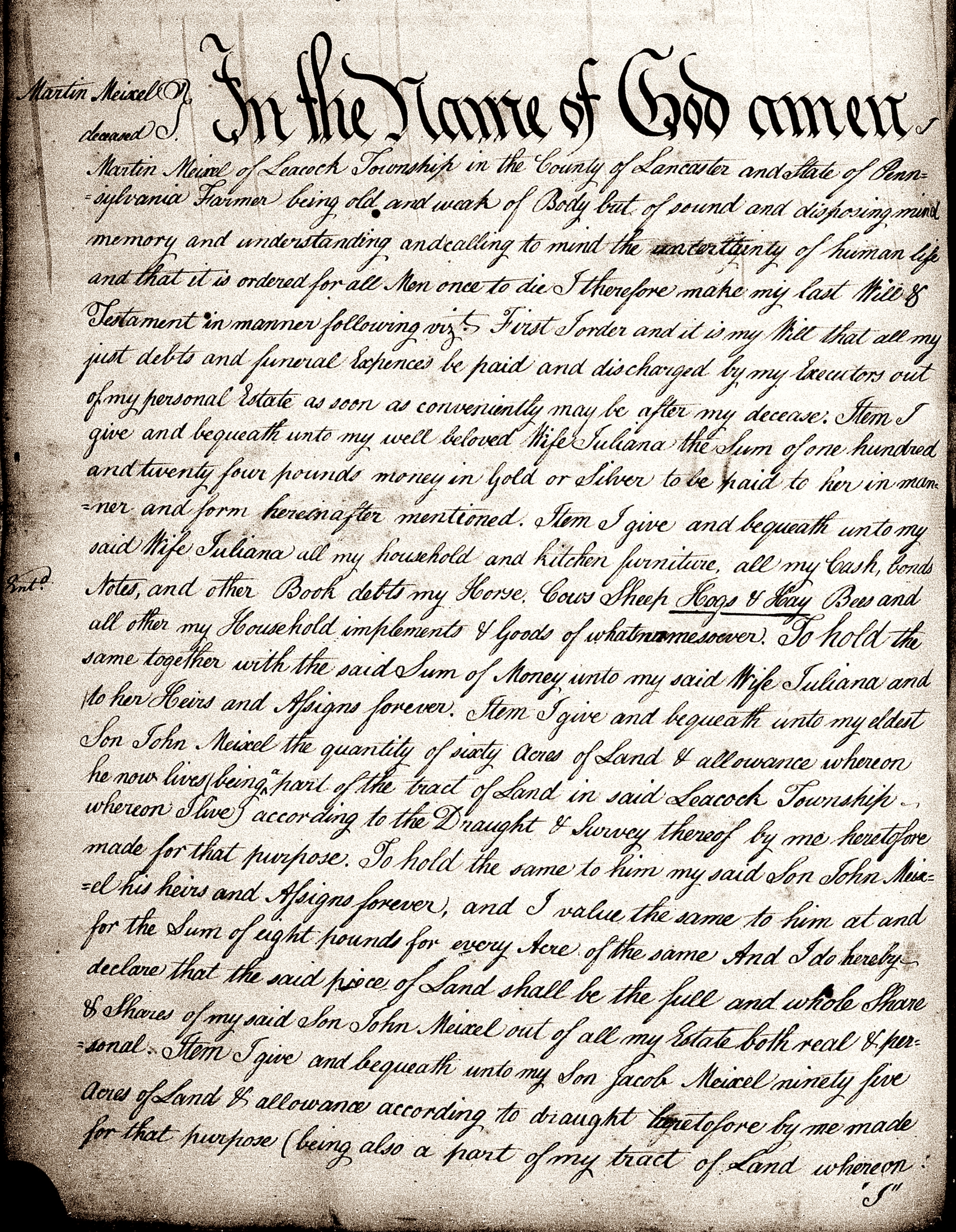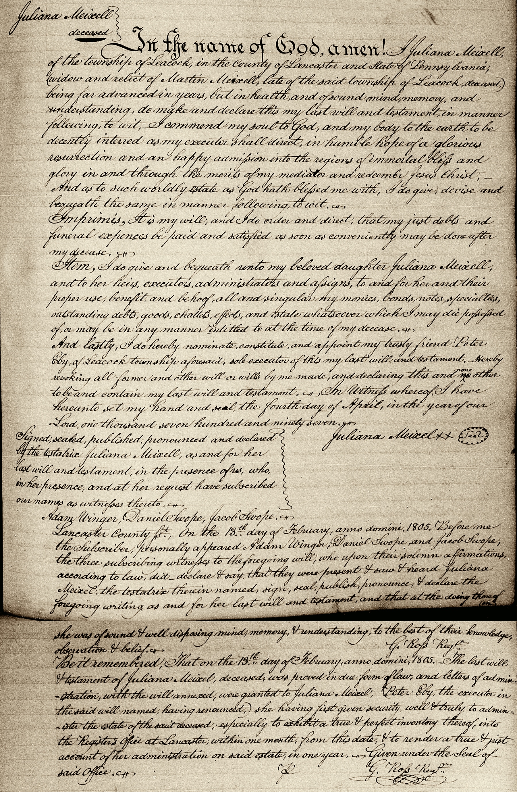 IN THE NAME OF GOD. AMEN! I, Juliana Meixel of the township of Leacock, in the County of Lancaster and State of Pennsylvania; being far advanced in years, but in health and sound mind, memory and understanding, do make and declare this my last Will and Testament in manner following to wit:
