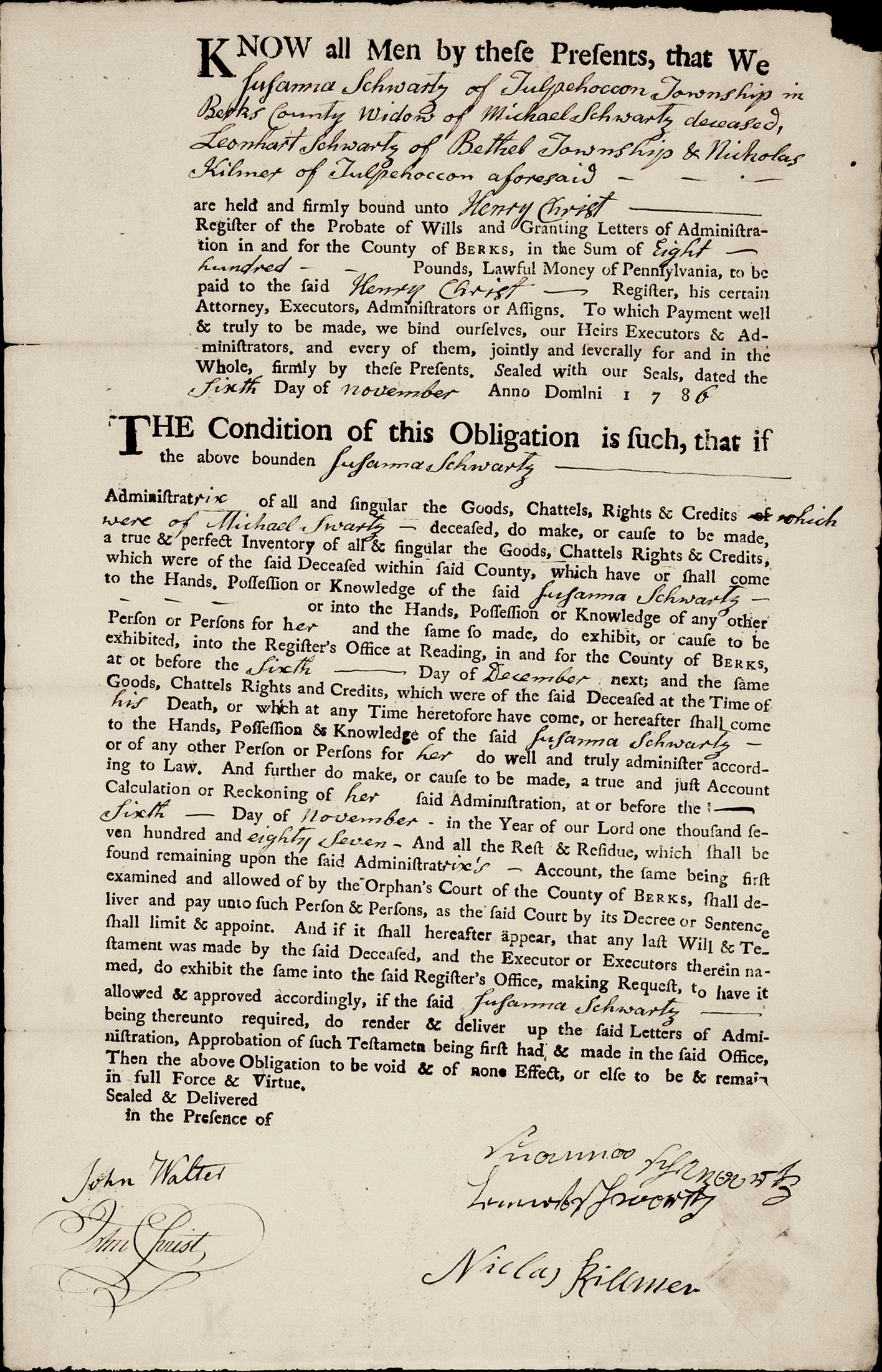 Wife Susannah... Issue Six children... George Schwartz, eldest son and heir at law of Michael Schwartz... and Michael, John, Anna Margaret, Elizabeth and Barbara. The said Michael, John, and Barbara being yet in the minority... [as of June 14 1791].
