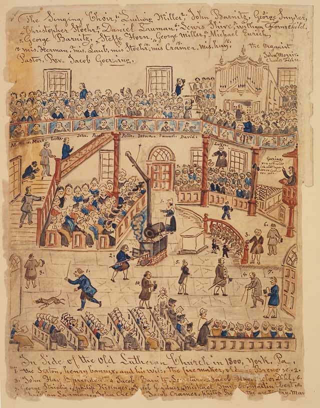 “Eva and Michael's church. Inside of the Old Lutheran Church in 1800, York, Pa.” Watercolor with pen and ink by Lewis Miller (1796-1882)