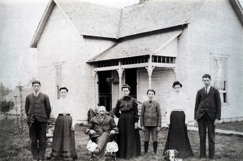 The Andrew Bushong family, at the house in Gilman, Madison County, Indiana, (east of Alexandria): Starting from far left: Clarence Elmer Bushong(Bud) Son - always had problems with bad legs; Buena Vista Bushong (Dune) Daughter; Andrew Jackson Bushong Father - had problems with dropsy; Amanda Fultz Bushong - Mother; Lertie Elmer Bushong -Son; Anna E Bushong (Annie) -Daughter - with dog; Albert F. Bushong (Al) - Son. For a differennt and smaller scan of this photo, but with captions, click here.