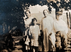 Photo on the left, Eliza with Stephen Rozell and son Aylette Rein Bushong. Photo on the right, Eliza with sister and sister's family. Left to right, Besse, Neva, Eliza, and Jack Oliver.