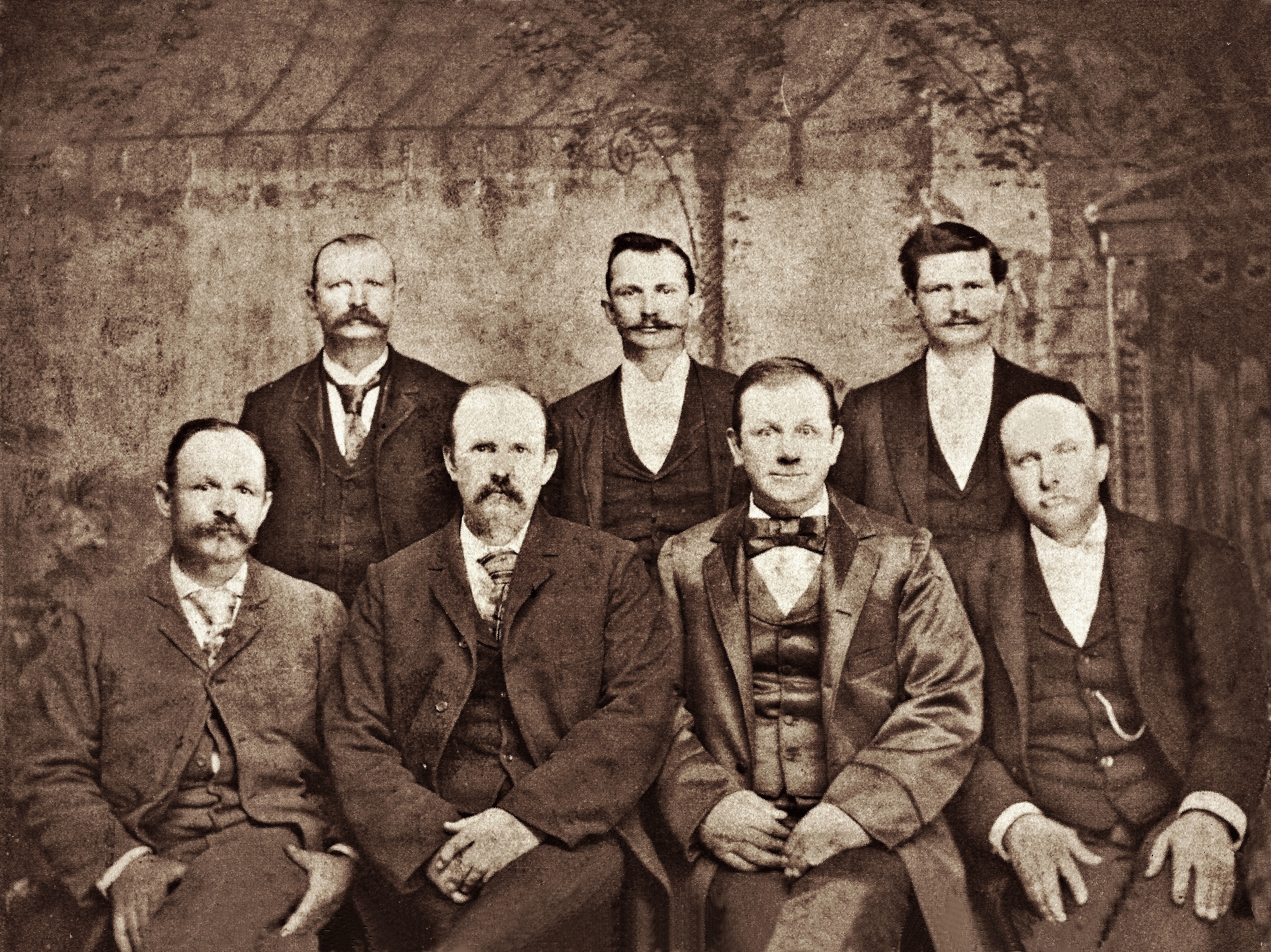 | | • | Front row, left to right: Isaac Newton Bushong, Henry Taylor Bushong, John Stuart Bushong and William Cornelius Bushong. |