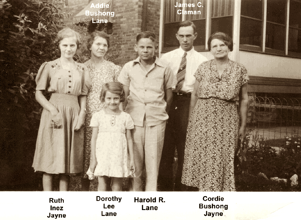 Photo is captioned, Left to right, Ruth Inez Jayne, Addie Bushong Lane, Dorothy Lee Lane, Harold R. Layne, James C. Claman, Cordie Bushong Jayne.