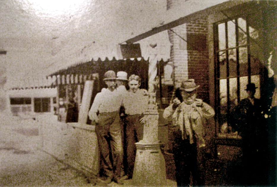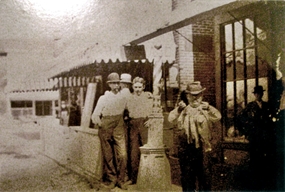 Right photo: Left to right, Bill Bushong, Eli Bushong, and Vern Bushong, in front of the Bushong Barbershop, in Syracuse, Indiana. Taken in the late 1890s or early 1900s.