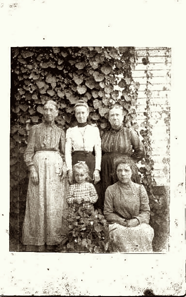 Left: Elizabeth, "Bett". On the right: Elizabeth with family. From left to right, Miss Elizabeth Ann Bushong, Martha Florence "Mattie" Bushong Good, Delilah Bowen Bushong. In front, Evla Bushong Good and Mary Hupp at the home of Anderson M. Bushong in New Market, Virginia. Circa 1903 to 1904.
