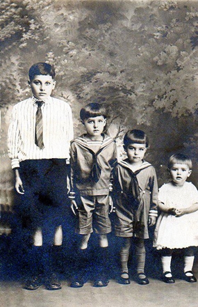The sons of Emery and Sarah. Photograph on the left, (left to right): from oldest to youngest, William Lee Bushong, Gilbert Franklin Bushong, Forest Berlin, Bushong and Garland Wisman Bushong. Next photograph: seated in front William Lee Bushong, and Gilbert Franklin Bushong, in back, Forest Berlin Bushong and Garland Wisman Bushong.