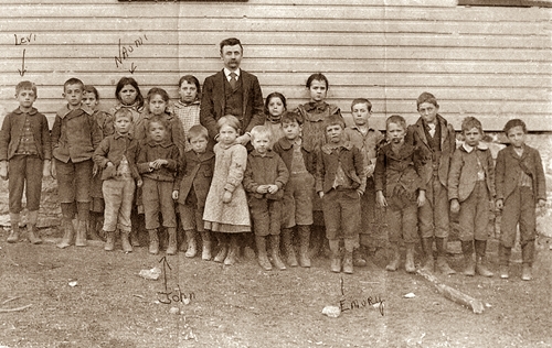 Emery and three siblings in a Harrisville Public School photo taken 1897. Photo is marked. Levi is far left, Naomi is back row, fourth from left. John Henry is second in the front row and Emery is sixth from the right.