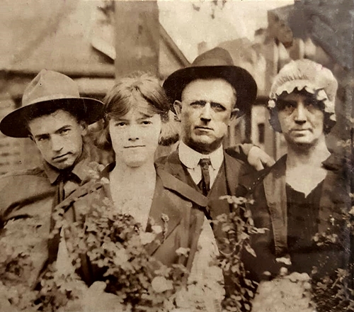 George, Emma, and son George and daughter, Nancy. From left to right George Alfred Bushong, Jr., Nancy Rhodes Bushong (Schlegel), George A. Bushong, Sr., and Emma Lee Cate Bushong. Probably taken in 1916, though photograph is labeled 1918, two years after George Sr's death.