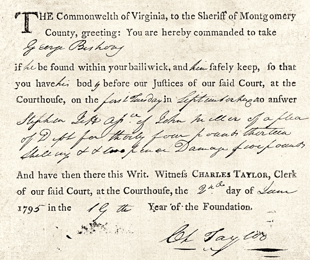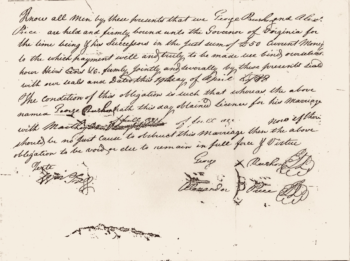 On the left, George and Martha's 1788 Marriage Bond. On the right, a 1795 Montgomery County, Virginia arrest warrant for George.