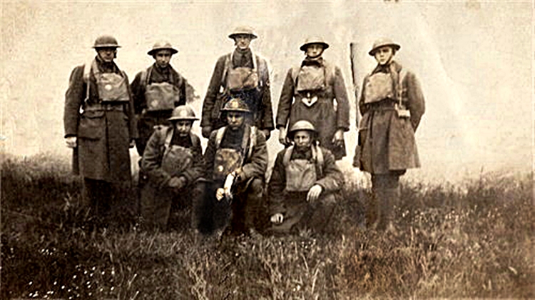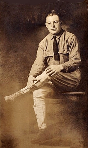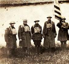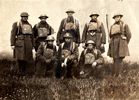 George was in the Army in 1918 during World War I. Here he's with other soldiers, back row, fourth from the left - notice his flag carrier. Second photo George is the flag bearer. Click photos to see larger, but the phoro on the left was enlarged a little, to see original size Click here