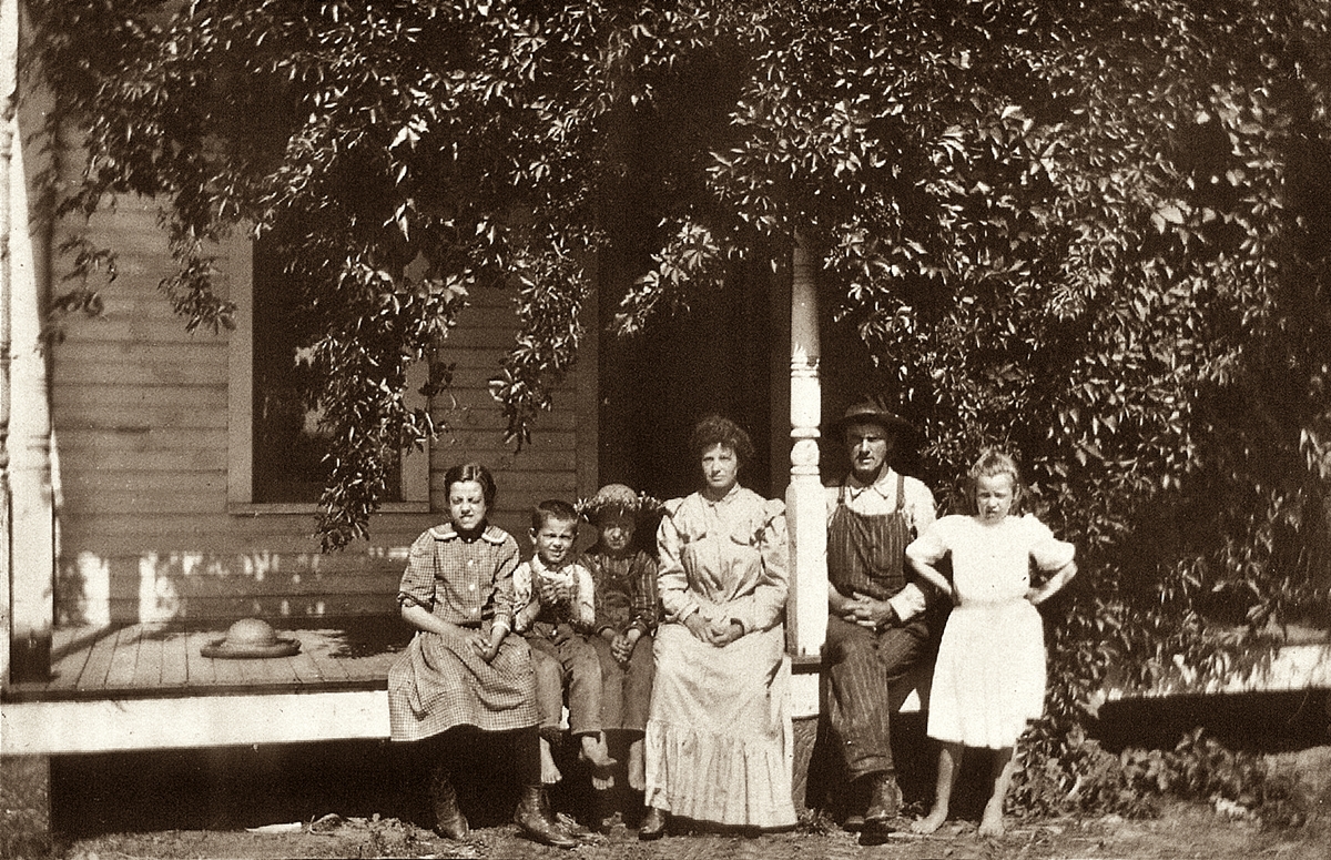 The whole family, left to right, Mildred Margaret Bushong, Joseph F. Bushong, Herbert Eugene Bushong, Annettie Hanson Bushong, Herbert James Bushong, and Rosamond Anna Bushong (Glaser). Taken by Ben Bushong.