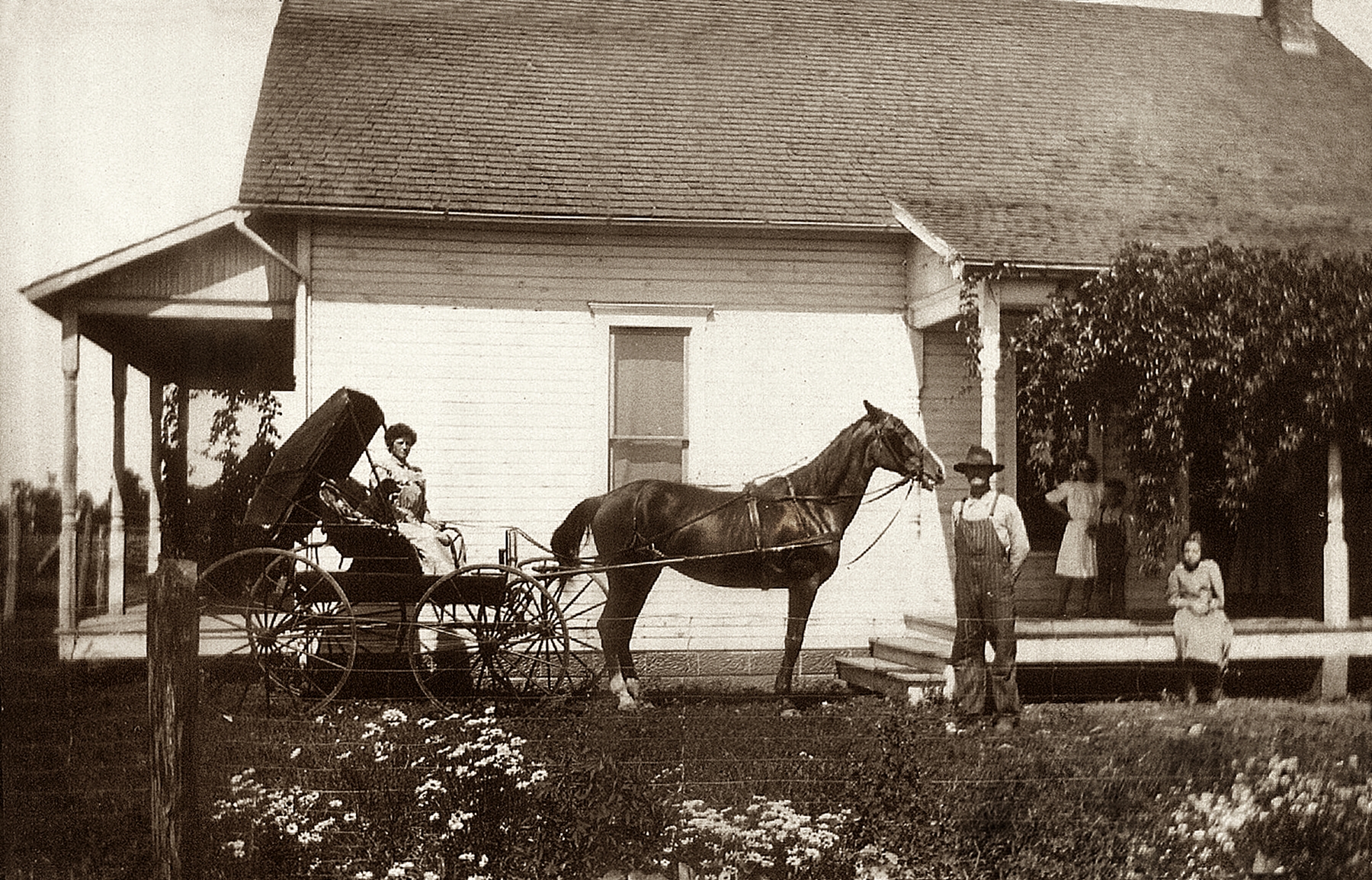 Annettie getting ready for a ride in the buggy. Herbert is holding the horse and children watching.