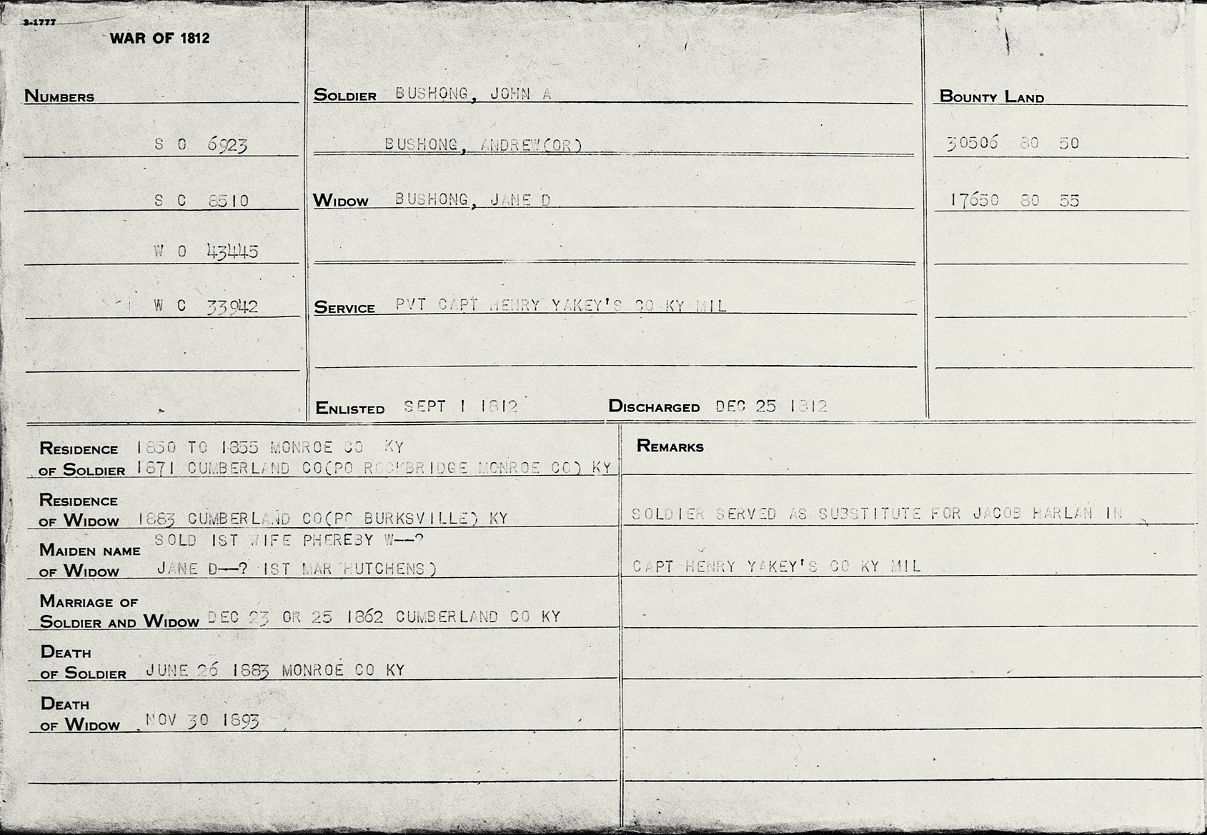 Veteran: War of 1812, in Capt Henry Yakey's Company, Kentucky Militia.