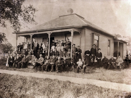 Samuel Mankin is identified at a family gathering, in around 1900. Samuel is in the middle row, the second person to the right of the third post. Lucretia is thought to be standing behind Samson and slightly to his right, (Samson's head is blocking some of Lucretia's dress). Photo taken at the home of Thomas Hales, father of Mary Elvira Hales Cox, in Keosauqua, Iowa. In the photo, there are 56 adults and 3 children. Acording to the owner of the original photograph, twenty-two have been reliably identified. Confirmed names include Hales, Cox, Blackledge, Watkins, Peterson, Mankin, Fowler, Dake. Eller, Payne, Mize. Other possible names are Moody, Crowell, Davis, Wells, Read, Wilson, Jacobson, Burton, Brockman, Arisman.