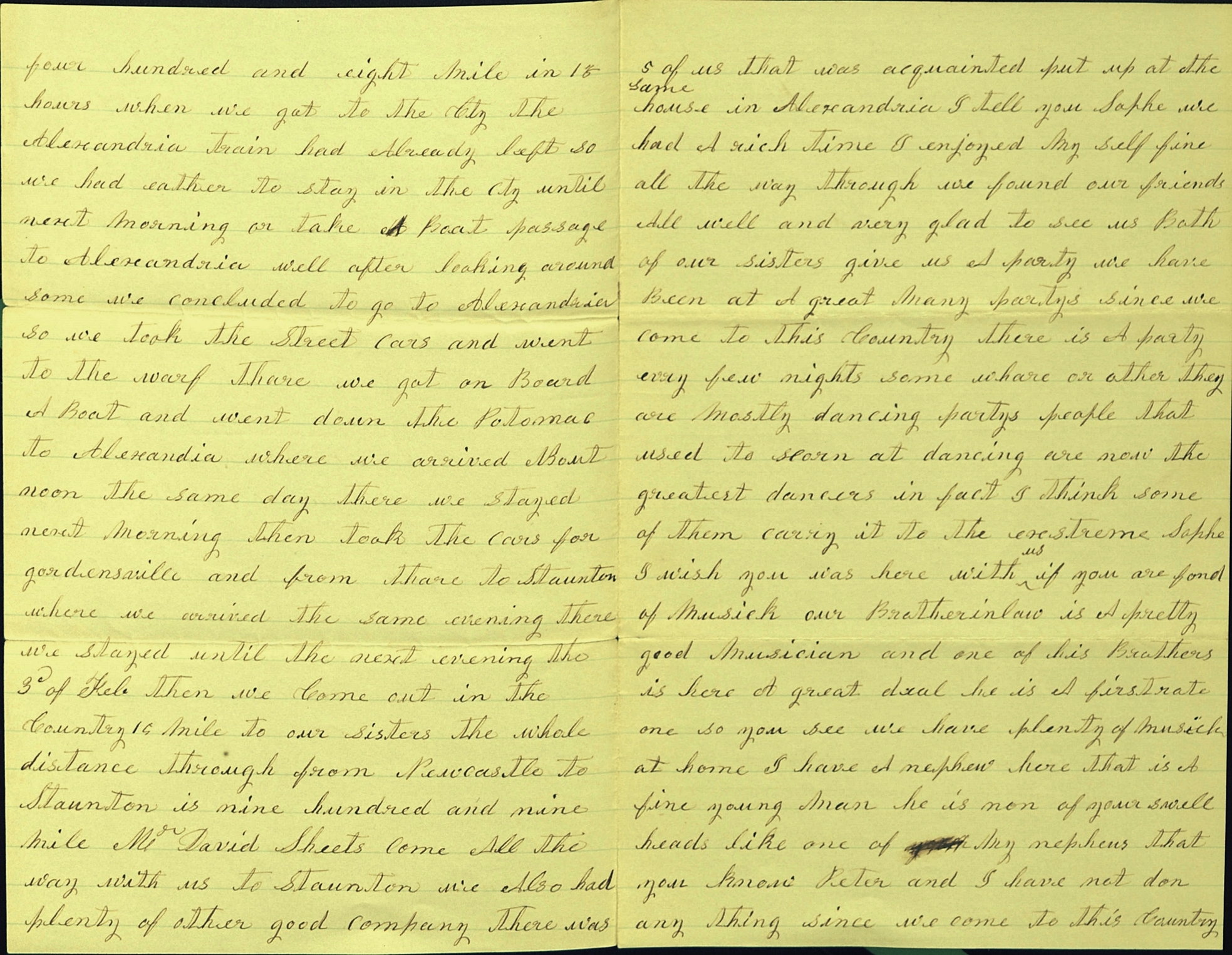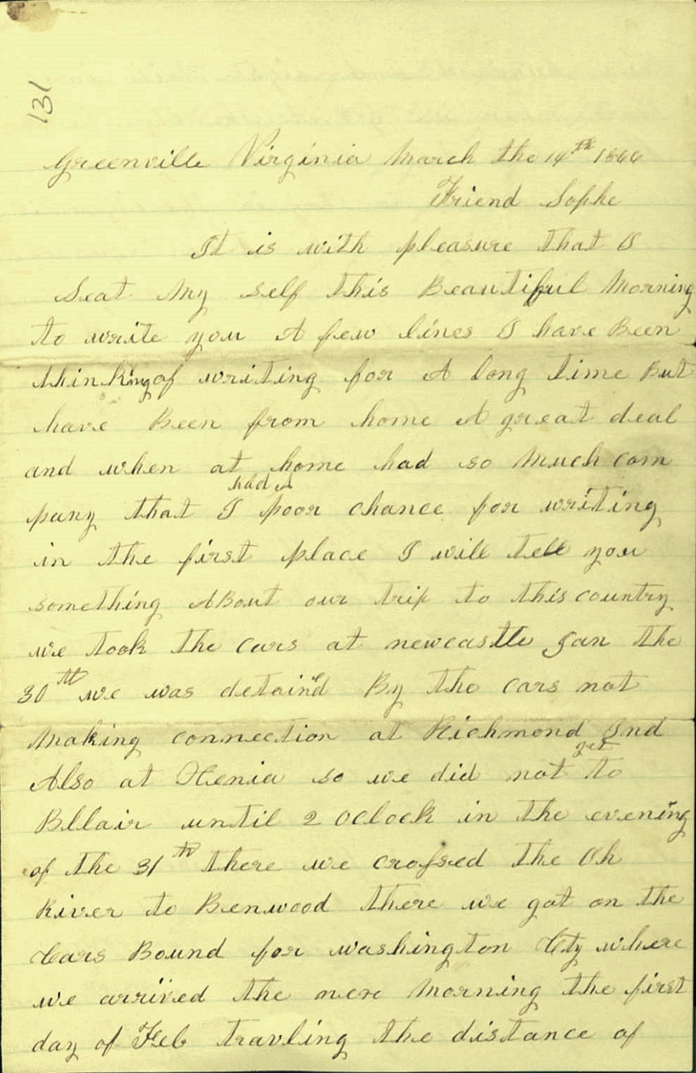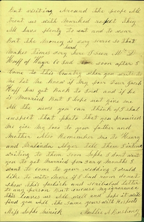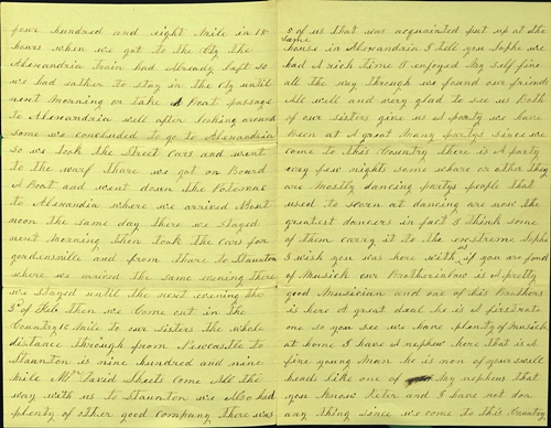 Above, page 1 of Mary Ann's letter to friend, Sophie Minnick (Knupp), written about her's and Peter's 1866 trip by railroad and other means, from New Castle, Henry County, Indiana, to Greenville, Augusta County, Virginia. Brother, Peter (Valentine) Bushong is mentioned in the third page.
