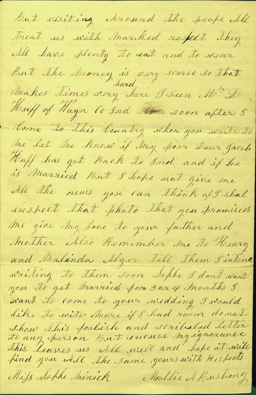 Scans of letter from UNC Southern Historical Collection, The Wilson Library, University of North Carolina at Chapel Hill. Folder 3: Minnick letters: Scan 64, 65, 66 see them here. They state this letter with others was purchased from Alvin Lohr of Hagerstown, Maryland, in March, May, and September 1956. Other letters in the folder are written by Andrew H. Minnick, Sophie's brother, who was in the Civil War was in Company H (later Company C), 69th Indiana Volunteers. Their parents were Mr. and Mrs. Michael Minnick.