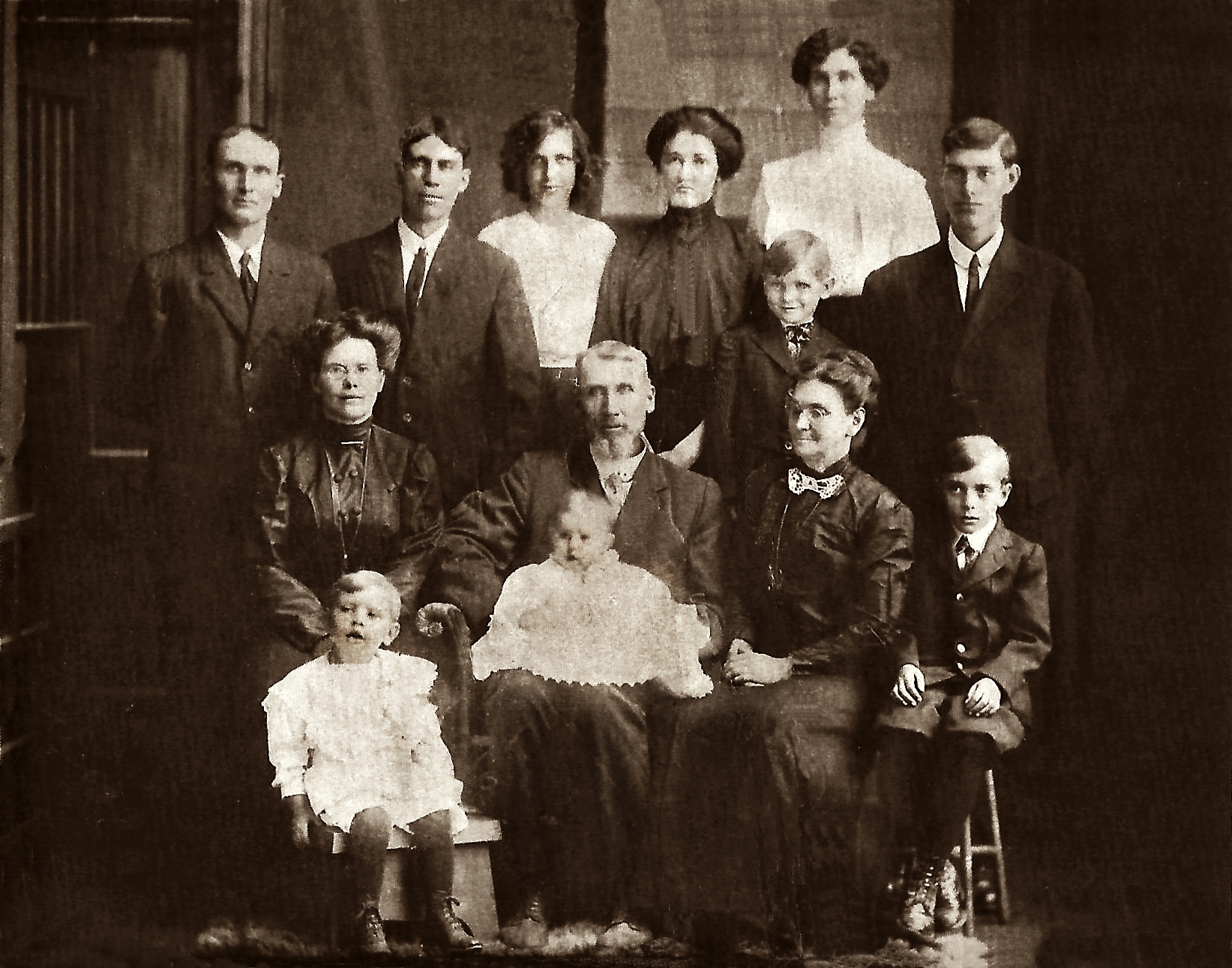 The Rachel Bushong and George Johnson family. Left to right, back row: Jacob Harlen Johnson, Francis Johnson, next believed to be Faye Choles, Rose Young Johnson, (wife of Francis), Blanch Johnson Cortner and her husband Claude. Young boy, Dorrel Cortner, Blanch and Claude's son. Next, three adults seated: Dolly Mae Johnson Tippton, George T. Johnson, Rachel Marie Bushong Johnson. Three children George Lyle Tippton, Hazel Voncille Tippton, and Ferrill Lorain Tippton (on stool).