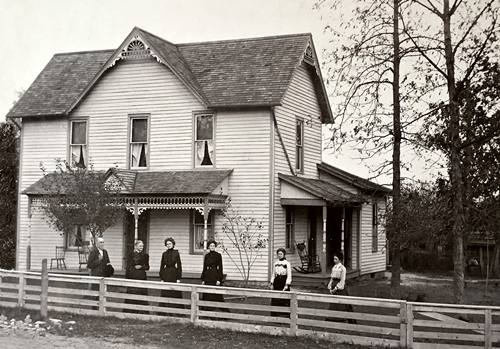 Joseph, Sarah and daughters at their home in Brookston, White County, Indiana, with four daughters. Believed to be, left to right, Elda Jane, Cora Ellen (Alkire), Flora Viola (Myers), and Minnie Bell. Taken around 1900.