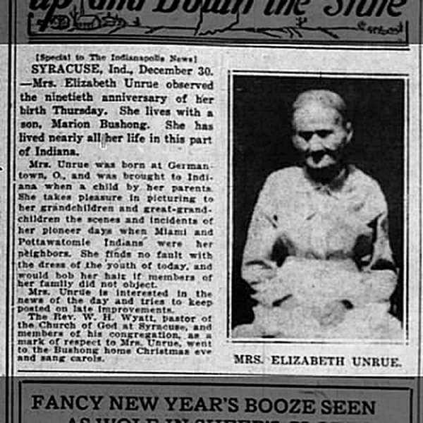 Shown Elizabeth on her ninetieth birthday. Elizabeth eventually married five times, including William and David Bushong who were third cousins. Also Jonathan Staver (vetting), Robert B. Traverse and her last husband, Jacob Unrue.