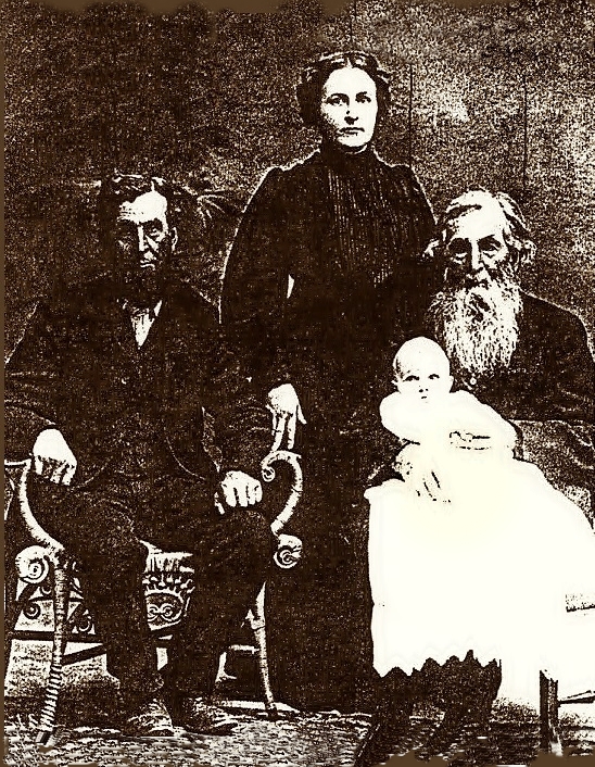 Photograph on left, William and Anna, with their children, Elstella and Emory, taken around 1890. On the right, seated on right, Benjamin Harrison Bushong with great grandson Donald Hill as a baby. Seated on the left is his son William Henry Bushong. Standing is granddaughter, Estella Mae Bushong Hill.